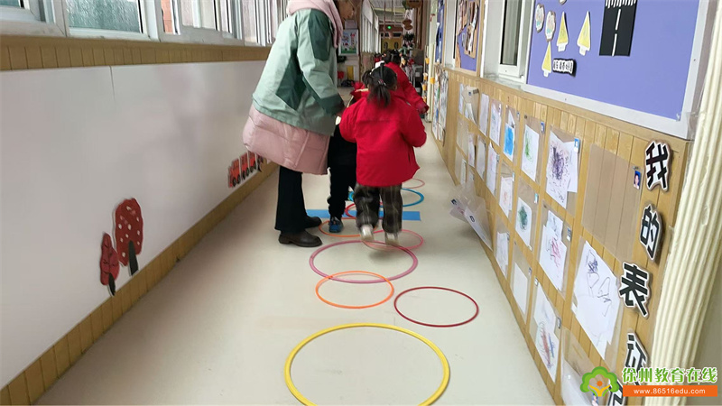 跳圈圈:幼儿依次跳过每个圈圈,可以单脚跳也可以双脚跳。通过跳圈,幼儿可以学习基本的跳跃和平衡技能,提高注意力和专注力。
