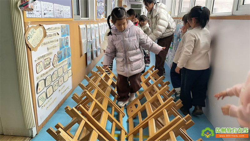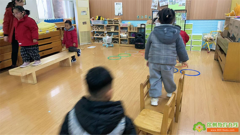 平衡木练习:幼儿在由椅子搭建的平衡木上行走,有助于提高他们的平衡能力和协调性。