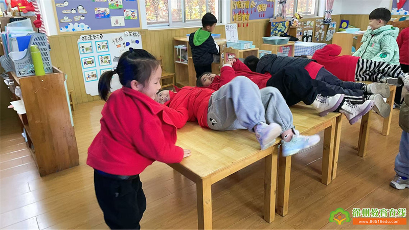翻滚练习:幼儿在由桌子搭建的平面上翻滚,尝试多种翻滚方式,包括前滚翻、后滚翻和侧滚翻。每种翻滚方式都需要不同的技巧和身体协调性,这有助于增强幼儿的肢体灵活性。