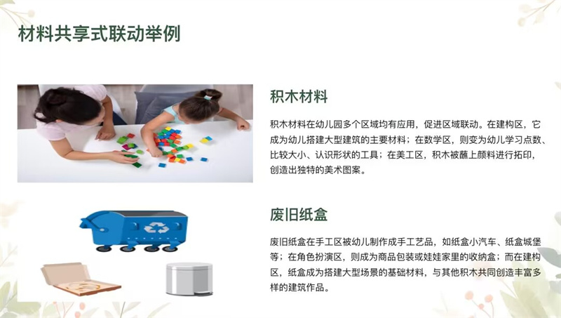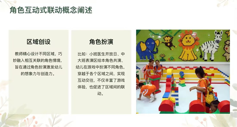 区域联动是一种创新的教育活动模式,它打破了传统单一班级区域各自为营的局限,将不同班级的特定区域(如建构区、美工区、阅读区等)有机结合起来,促进幼儿之间、班级之间的互动交流与资源共享。在这种模式下,幼儿可以跨班级参与到其他班级的区域活动中,共享各区域的材料、空间和人力资源,合作完成游戏,从而拓宽社交范围,培养合作、创新思维以及解决问题的能力,以实现更全面的教育目标。