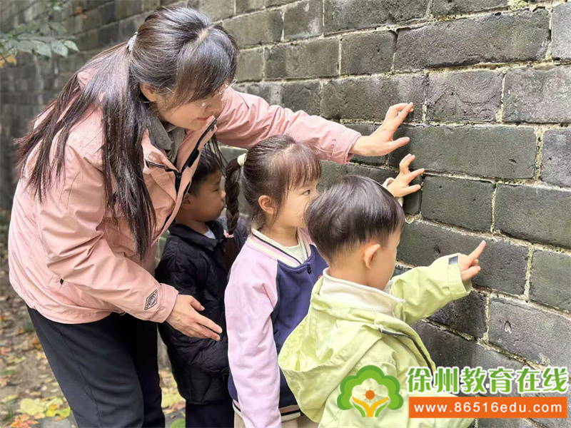 温暖的初冬阳光洒进快哉亭公园,绿柠檬班的小朋友们,排着整齐的队伍,走进公园里探究。这时,李祉默小朋友发现了一处古城墙,说:“陈老师,那里有古城墙。”其他小朋友也看向古城墙,小朋友们走向古城墙,有的摸一摸,有的敲一敲。