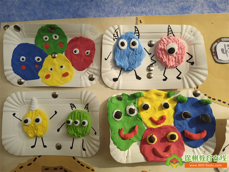 小朋友们,快看,是情绪小怪兽来了。我们是情绪小怪兽,你们知道我们分别代表的是什么情绪吗? 绿色代表的是平静、蓝色代表的是忧伤、红色代表的是生气、黄色代表的是快乐、粉色代表的是喜欢等等。我们就一起来制做“多变的情绪小怪兽”吧!一起和它做游戏喽!