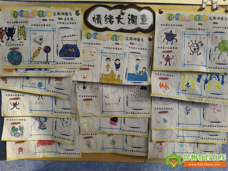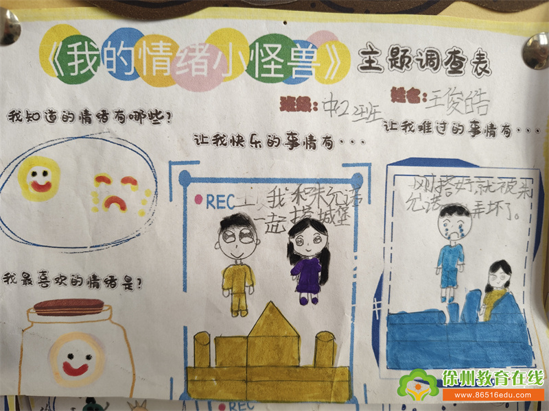 在小小的调查表中,孩子们回忆了自己的情绪小故事,用图画的方式表达自己对情绪的理解。