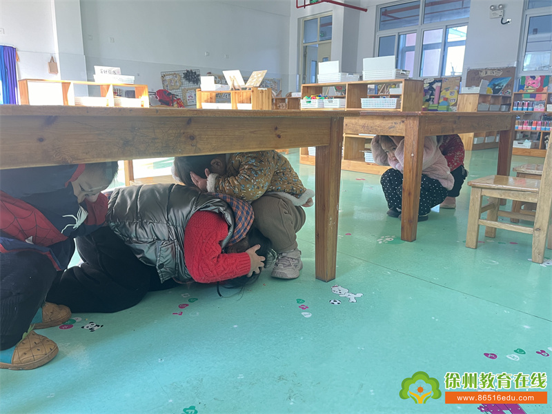 警报铃声响起,所有人员立即停止活动,以最快速度躲到就近“安全三角区”,迅速抱头,躲在桌下,蜷缩身体,降低重心,双手护头躲避,老师一边安抚幼儿,一边指导他们采取正确的躲避危险方式。