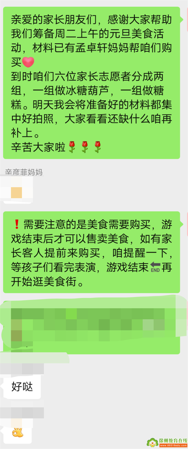 老师和家长一起通过线上、线下商讨环境的布置以及美食街材料的准备。