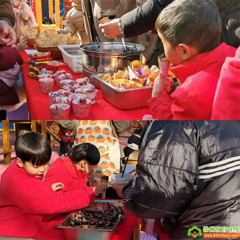 伴随着热闹的音乐,年味十足的美食吸引了不少小朋友,冰糖葫芦、爆米花、炸丸子、腊八粥、饺子、炒花生,一道道香甜可口的小吃,满足了孩子们的味蕾体验,那是“新年”甜甜的滋味!