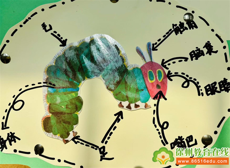 教师:“宝贝们,你们看到的毛毛虫是什么模样的呢?”