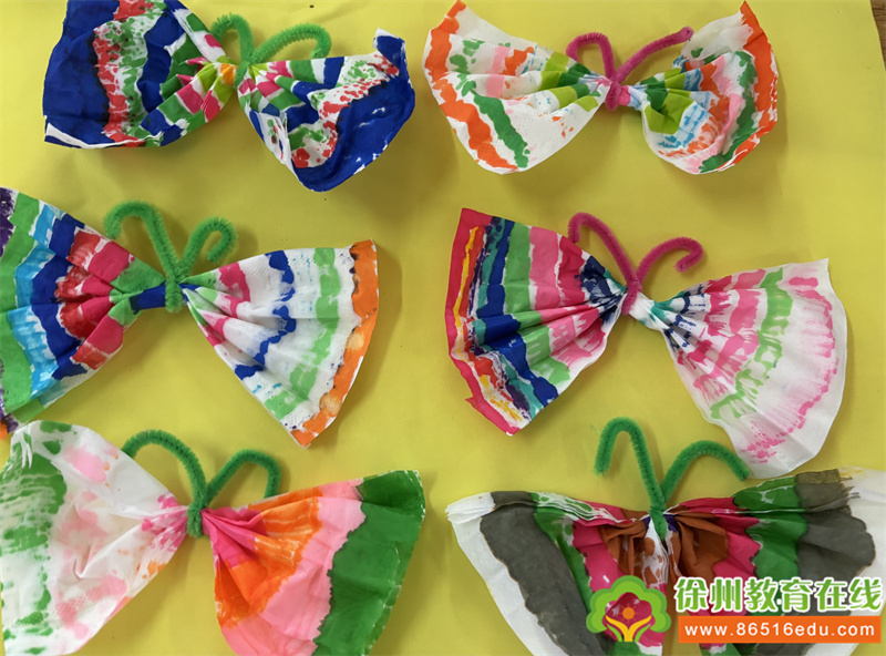 孩子们兴趣高涨,立刻行动起来,用皱纹纸、扭扭棒、画笔等材料精心制作缤纷小巧的蝴蝶。