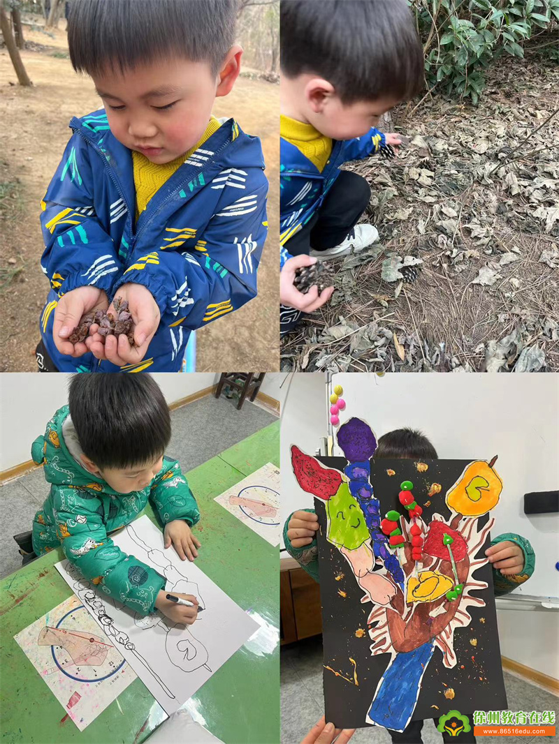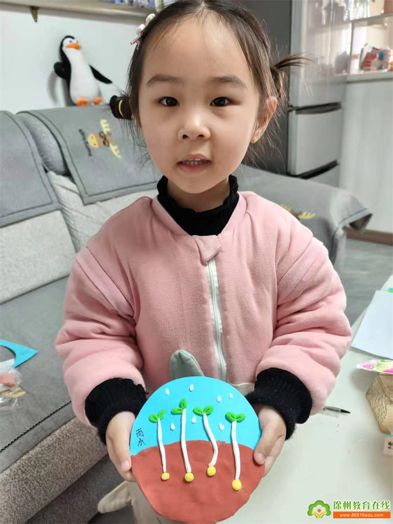 活动中,孩子们还与家人共同创作了以雨水为主题的艺术作品。有的孩子用水粉画出了淅淅沥沥的小雨滴,仿佛身临其境地感受到了春雨的细腻与温柔;有的家庭利用黏土捏制出可爱的春芽,展现了生命在雨水滋润下的勃勃生机;还有的家庭别出心裁,用捡拾的松果、树叶等自然物描绘出春天的美好画卷,寓意着雨水滋养万物,生命蓬勃生长。