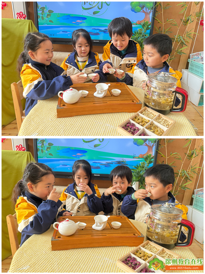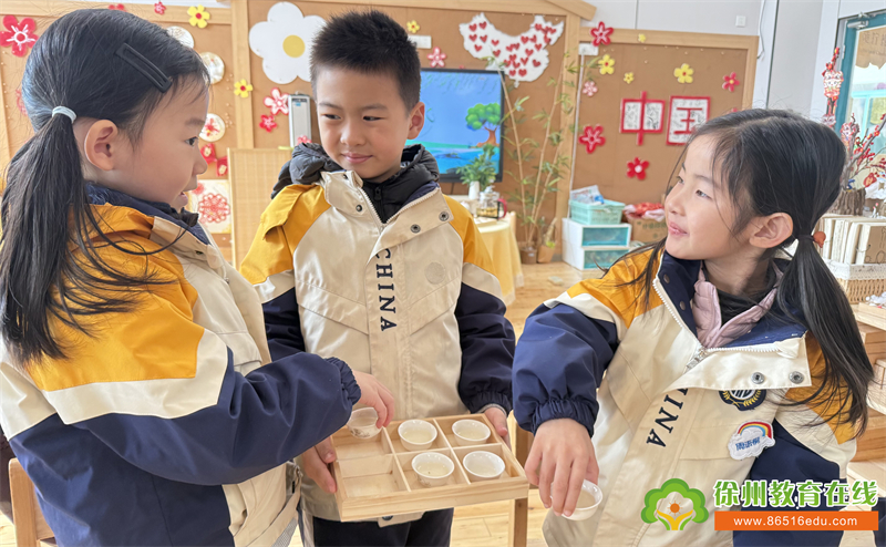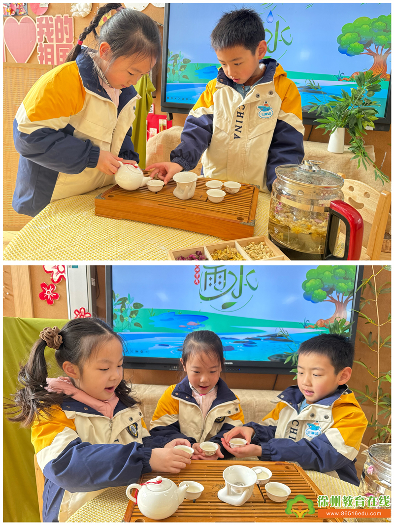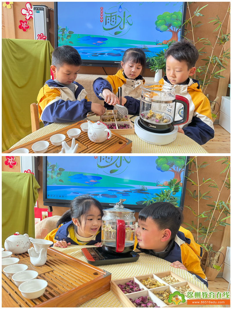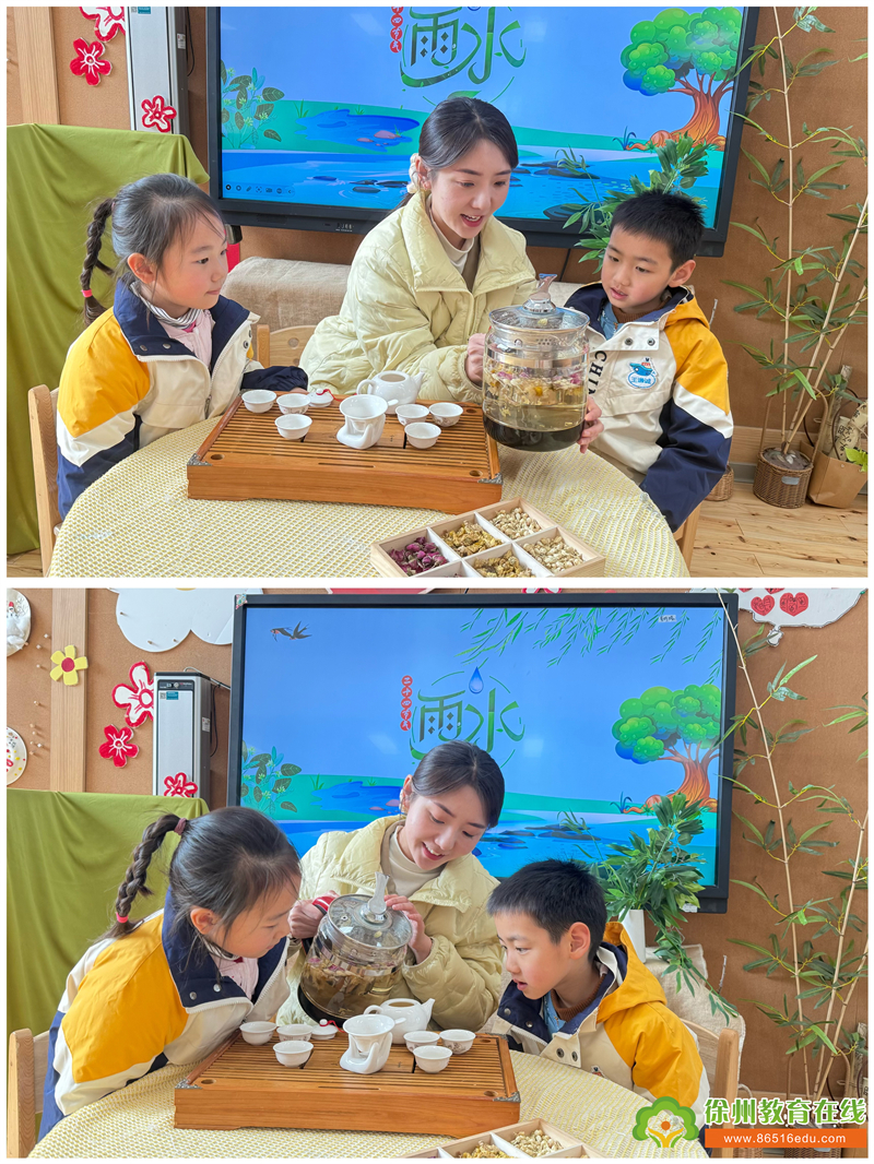 雨水临,春茶生。在这冷暖交替、雨水不断的时节,小朋友们一同煮“三花茶”去除潮气,共享开春新气象。