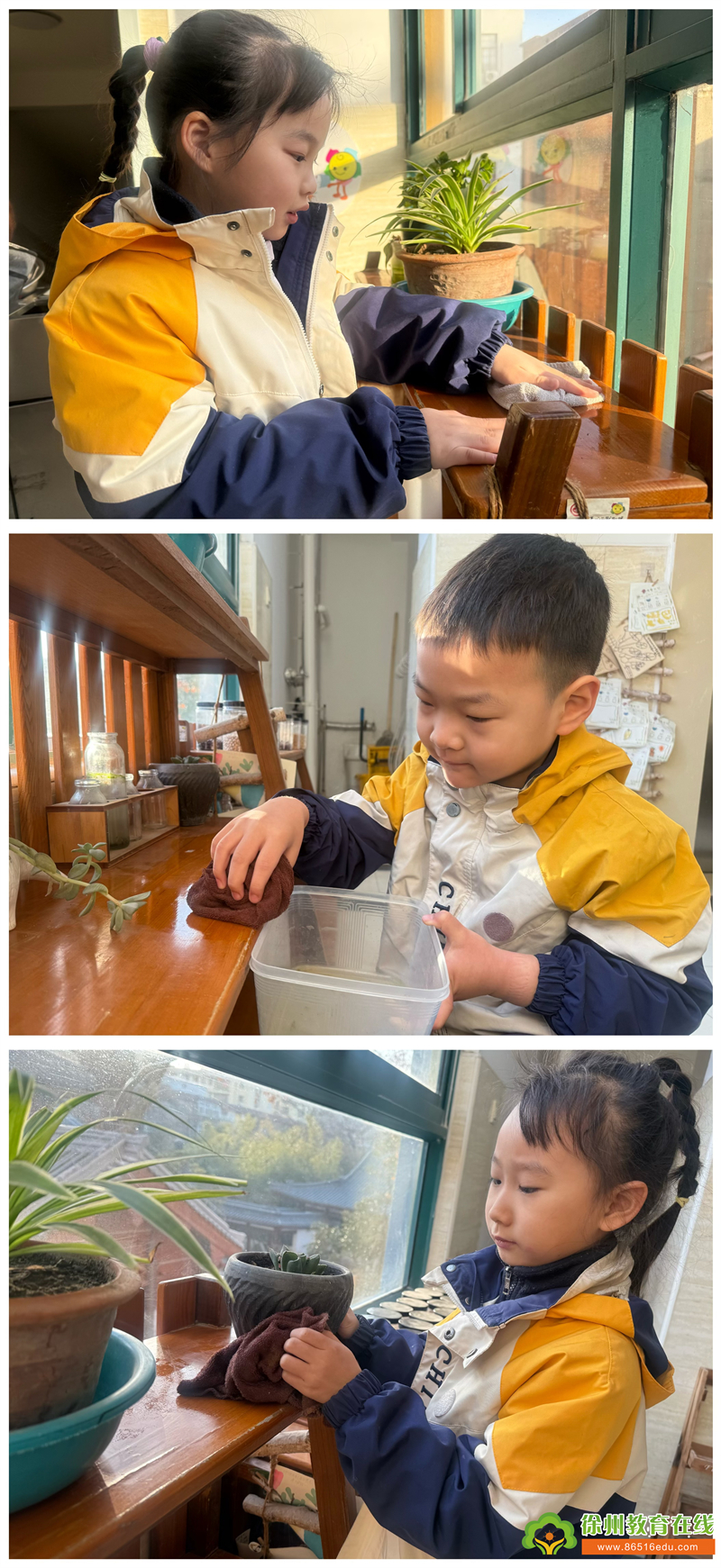 雨水至,春耕始。小朋友们拿起抹布来到自然角。为了给植物更好的环境,他们用抹布认真专注地擦拭着植物架。
