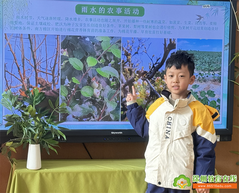 原来,随着雨水节气的到来,天气慢慢变暖,冰雪融化,大地像从沉睡中苏醒过来。小朋友们睁着好奇的大眼睛,听着关于“獭祭鱼”“鸿雁来”“草木萌动”的物候变化,仿佛看到了大自然热闹的春日派对。