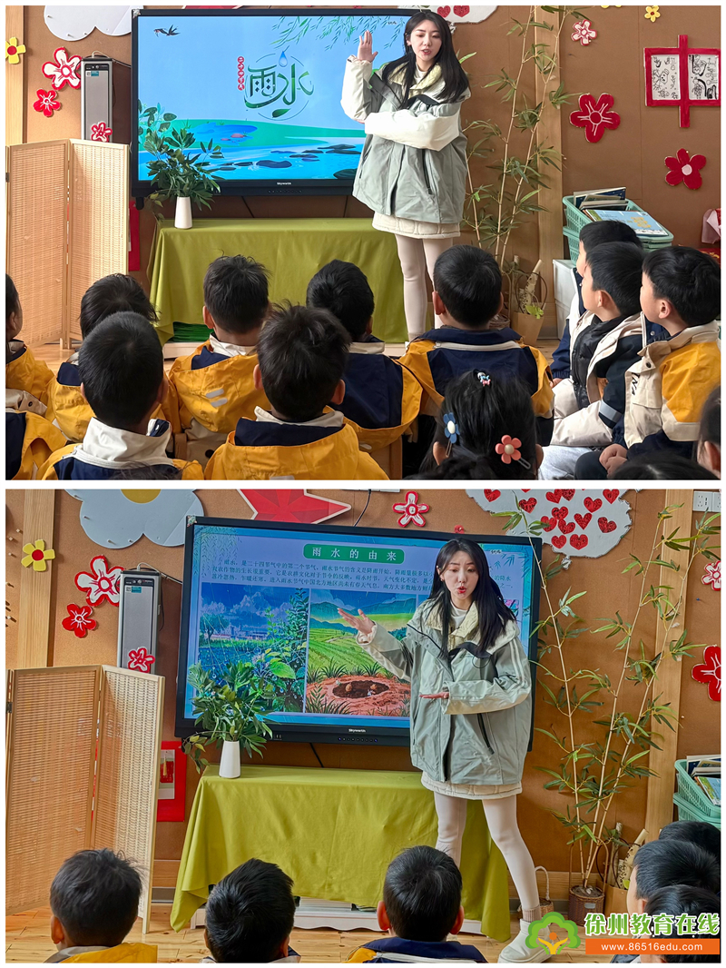 在这个万物复苏的时节,老师通过生动有趣的图片、视频,给小朋友们讲述着雨水节气的秘密。