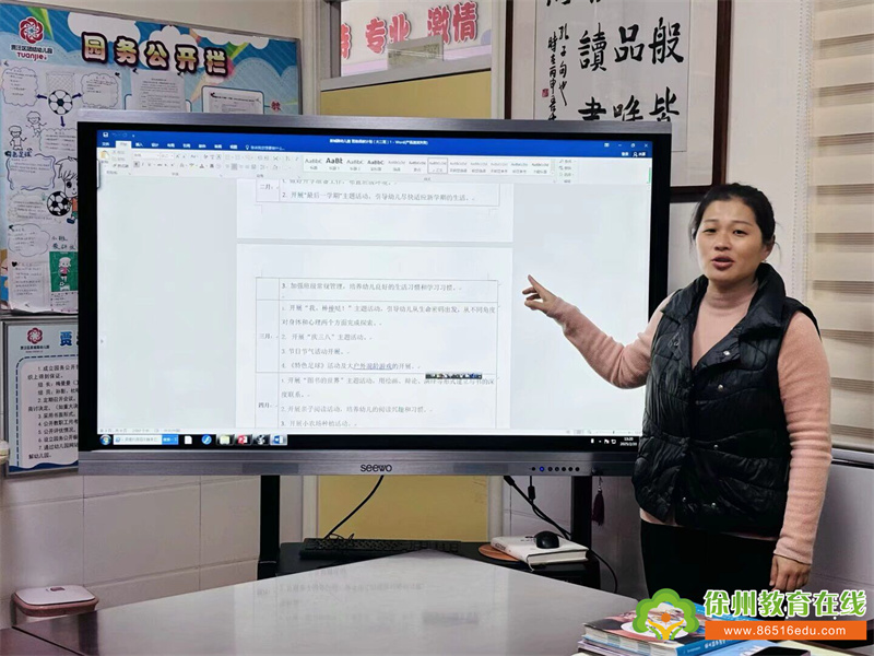 活动中,业务园长杜晓昕以目录形式与大家分享了本学期的保教工作行事历。她首先带领大家审议了本学期教育活动安排,从主题活动到节日节气活动再到幼小衔接活动,每一项都精心安排,旨在通过丰富多彩的活动,赋能幼儿快乐成长。
