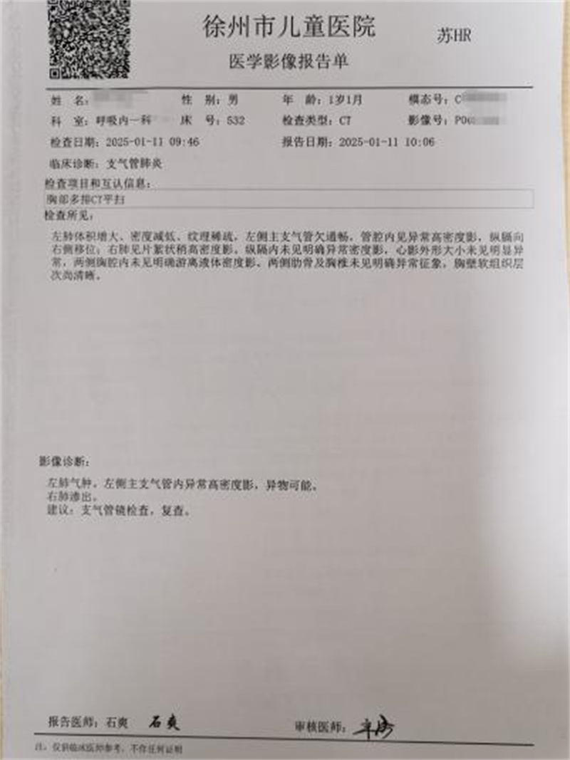 检查结果一出来,放射科就急急忙忙地打电话来报危急值。原来,CT报告显示小宝宝的左侧支气管里可能有异物。异物在呼吸内科并不罕见,小孩子吃东西时容易呛到,有时候家长喂食瓜子、花生时,孩子一呛咳,东西就可能掉进支气管里。支气管里的异物会引起反复咳嗽、喘气,甚至堵塞气道,引起肺不张,划破气道黏膜还会咯血、甚至支气管穿孔。在临床上,支气管异物属于危急情况,需要立即报告。