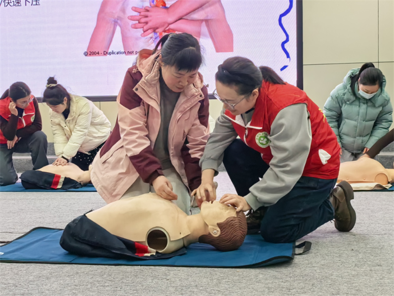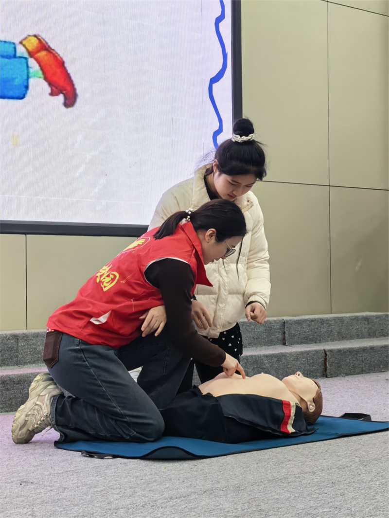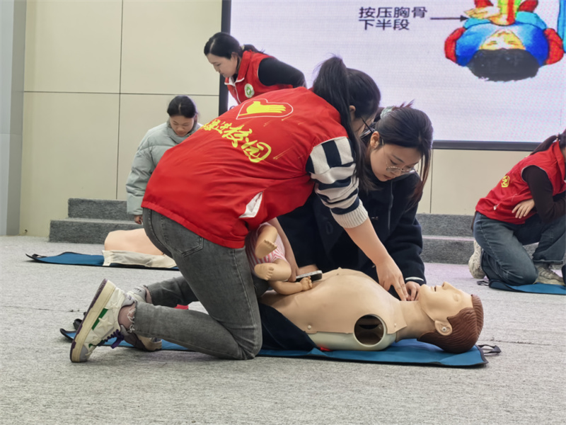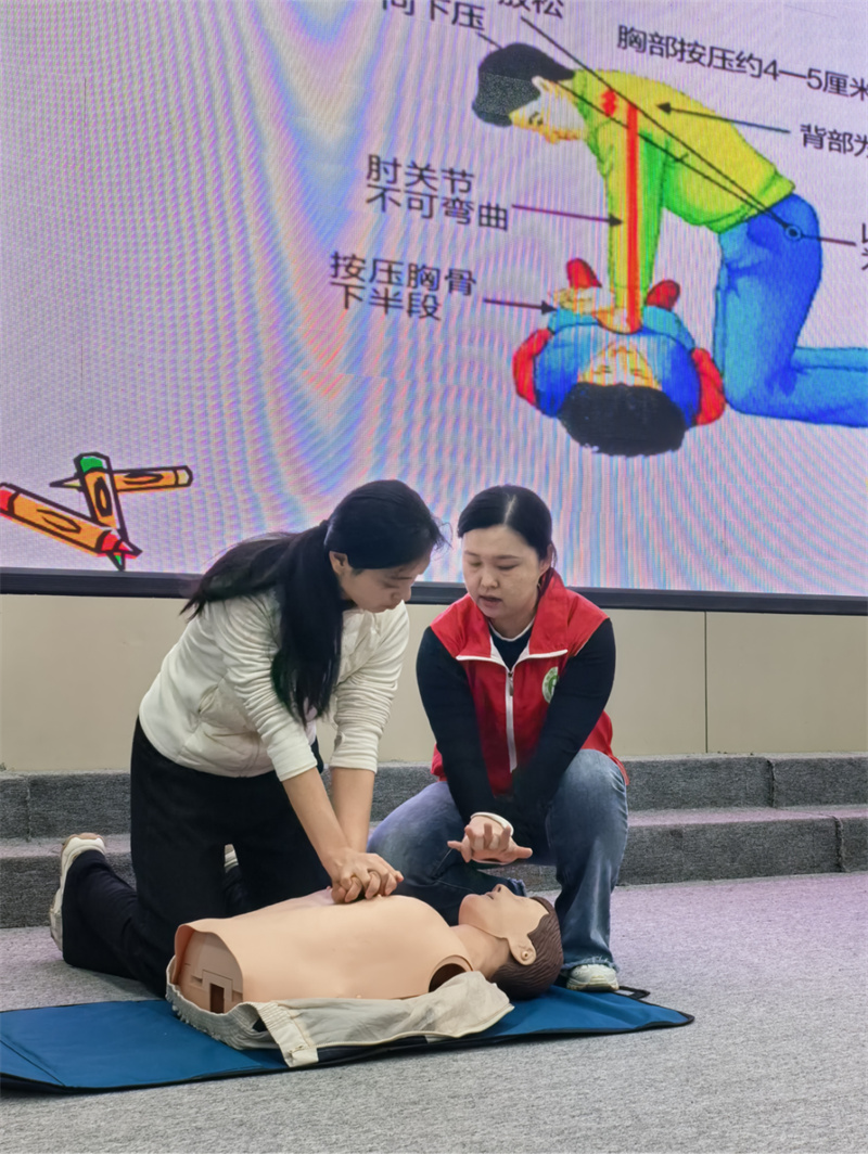 培训采用理论讲解与实操演练相结合的方式,姜朕主任详细讲解了各种急救场景下的判断要点和处理方法,并针对老师们提出的问题进行耐心解答。之后老师们分组进行实战演练,6名操作指导人员一对一给与示范指导,老师们积极参与,认真练习,现场学习氛围浓厚。