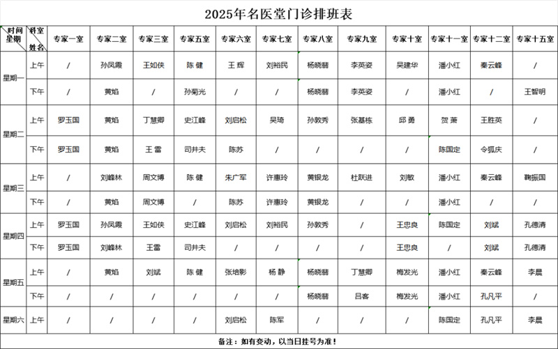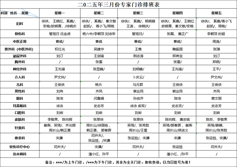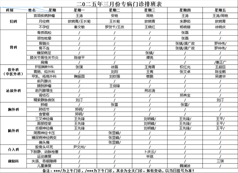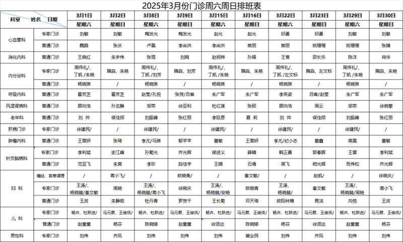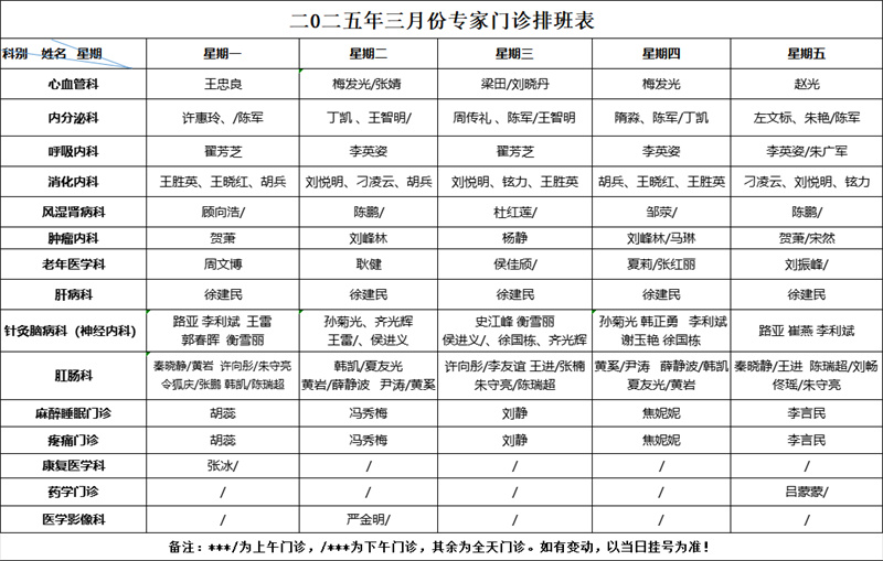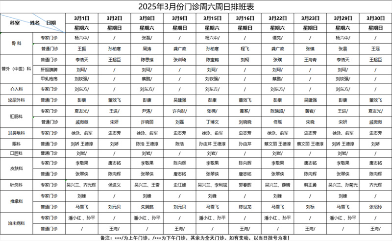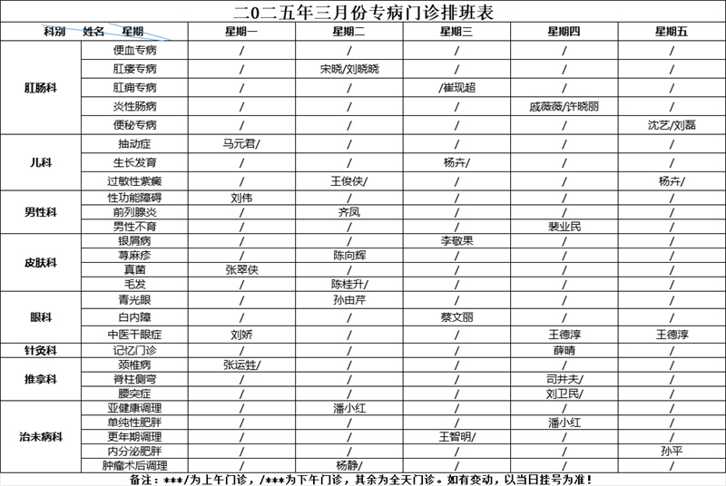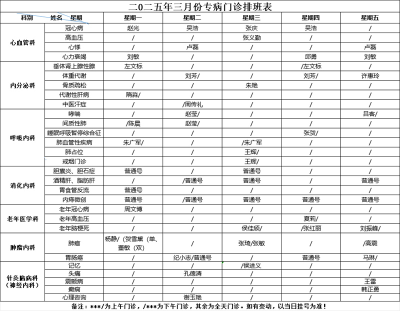 为了方便您就医 请您来院前 提前预约挂号 按照预约时间段 提前半小时到达就诊区 凭电子挂号单刷码报到 现将 3月份门诊排班表 分享给大家,建议收藏! 2025年3月份 专家门诊排班表(周一至周五) 2025年3月份 专病门诊排班表 2025年3月份名医堂 专家门诊排班表 2025年3月份周末门诊排班表