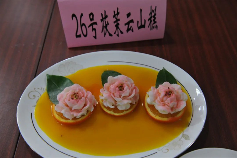 以茯苓健脾宁心、茉莉花疏肝解郁为灵感,搭配山药与桂花蜜,制成绵密清甜的糕点。作品以“玫瑰”为造型,寓意“药食同源,滋养身心”。
