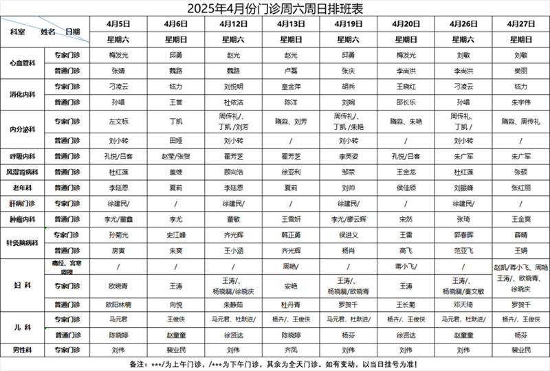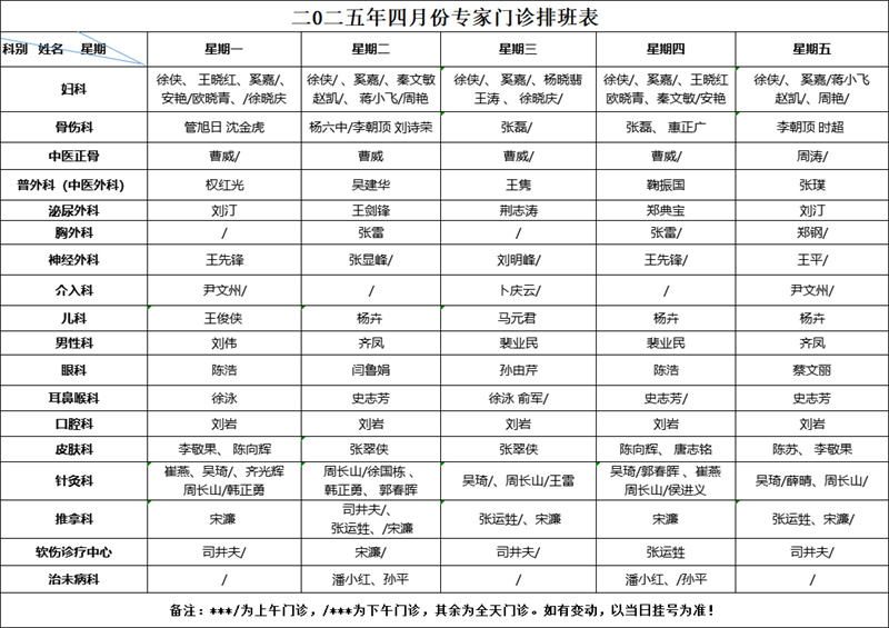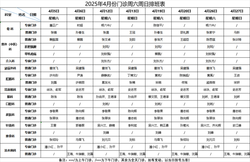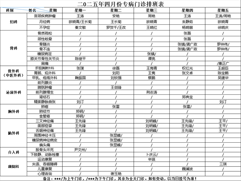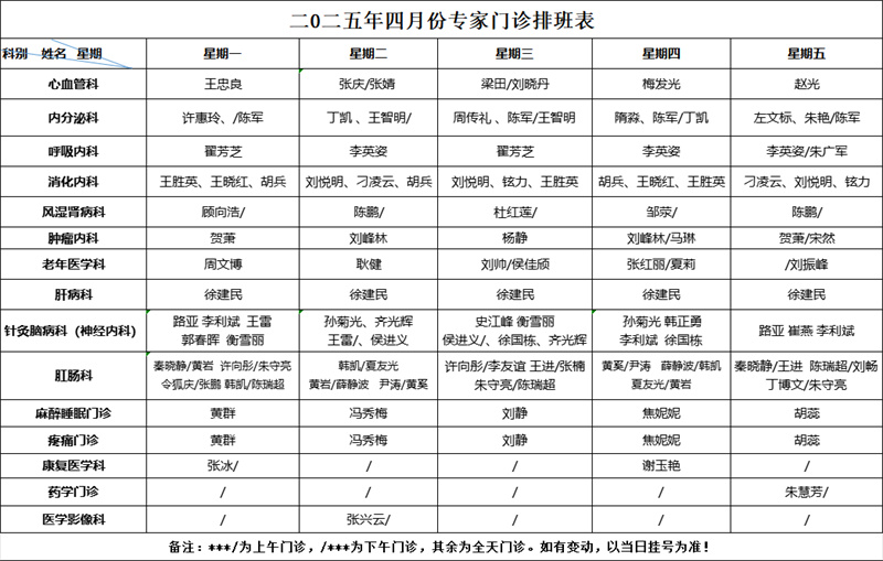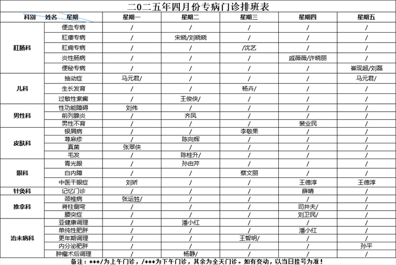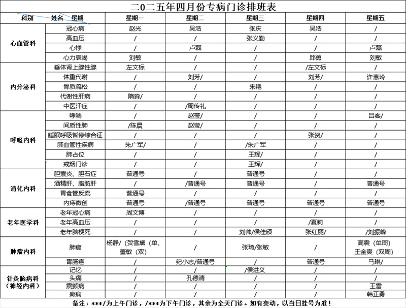 为了方便您就医 请您来院前 提前预约挂号 按照预约时间段 提前半小时到达就诊区 凭电子挂号单刷码报到 现将 4月份门诊排班表 分享给大家,建议收藏! 2025年4月份 专家门诊排班表(周一至周五)2025年4月份 专病门诊排班表 2025年4月份名医堂 专家门诊排班表 2025年4月份周末门诊排班表