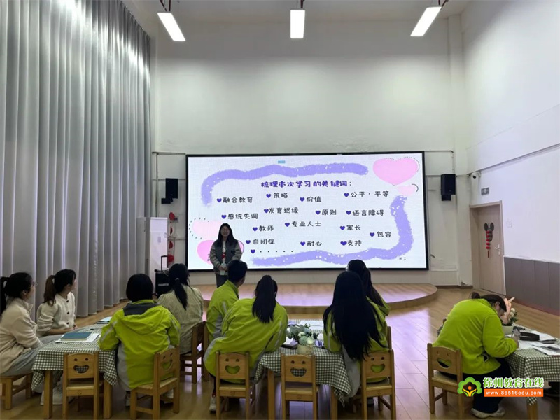 教师们观看了关于自闭症幼儿及感统失调幼儿的教育案例,了解相关特殊教育知识。只有心中没有歧视,诚心接纳,才能让特殊幼儿感到被关心与温暖,从而慢慢改正自己不良的行为,主动与教师和同伴建立良好的关系。