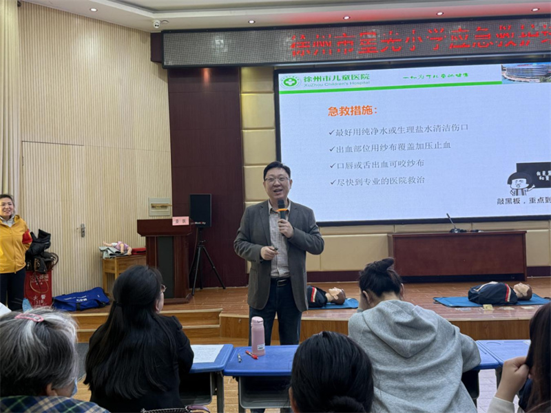 受徐州市星光小学邀请,我院呼吸内科“送健康,进校园”公益活动项目组于2025年4月14日下午为全校教师开展了一场以“预防校园意外伤害和常见疾病的急救方法”为主题的健康讲座及实操培训。活动通过理论讲解、情景模拟、一对一指导等形式,助力教师掌握急救技能,为校园安全再添保障。