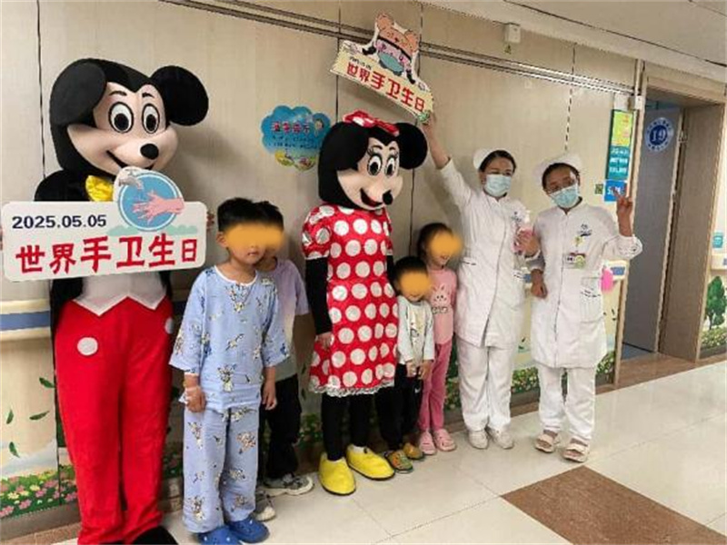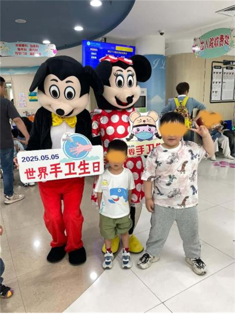 紧接着,护理团队移步门诊和病房开展活动。感控护士装扮成米奇、米妮形象,走到孩子们的病床边,耐心地为每一位孩子讲解手卫生知识,并进行操作示范。当看到深受喜爱的米奇、米妮出现在眼前,孩子们兴奋不已,这份喜悦也化作学习动力,大家在学习手卫生知识与操作时,显得格外专注和认真。