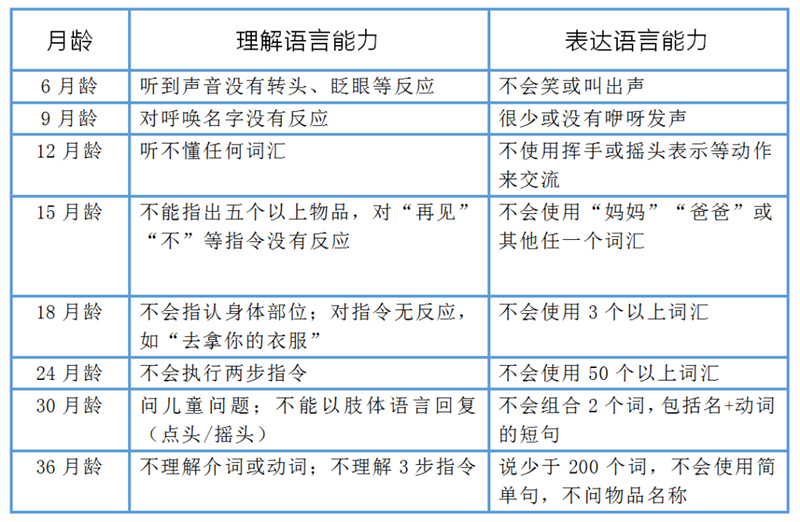 疫情结束后来儿保门诊就诊的类似上面问题的几乎每天都会遇到,大多数的家长不知道孩子在哪个年龄段该说多少词汇量,而且形成一个明显的分水岭。为了让家长朋友在平时就能对孩子的语言发育有一个基本的了解,今天我们列出来两个清楚的表格,请您按照孩子的年龄和相应的语言发育情况做一个对照,需要注意的是,如果您发现孩子在语言发育预警征表格里出现了相似的情况,请您带孩子及时到医院就诊。