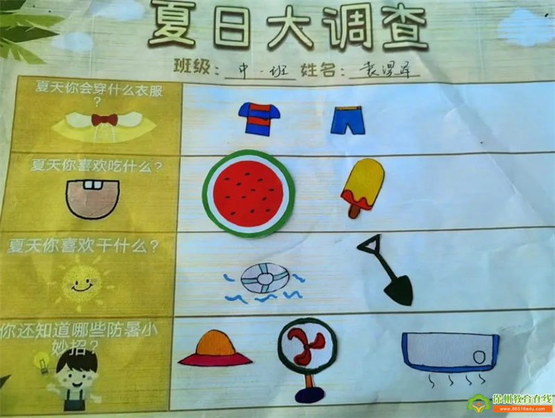 孩子们围绕夏天有说不完的话题,于是我们设计了一张“我知道的夏天”调查表,请幼儿把自己喜欢的夏天画一下,我们一起来看下孩子们画的调查表。