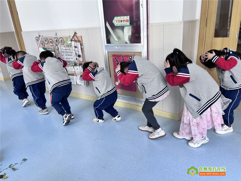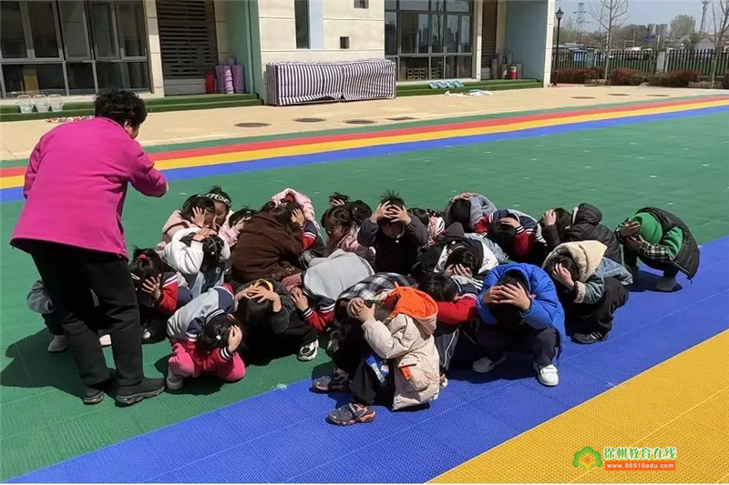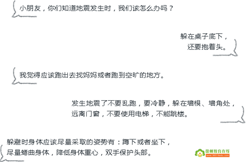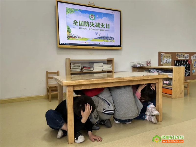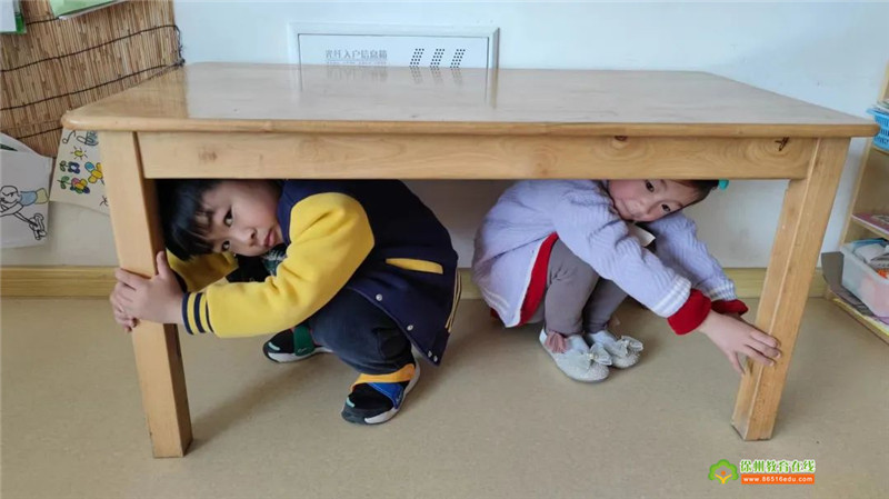 当听到第一声警报声?,幼儿都迅速的躲在安全的地方紧急避震,迅速躲到桌子下、墙角等较安全的地方,低头弯腰、双手护头蹲在安全位置就地避震。