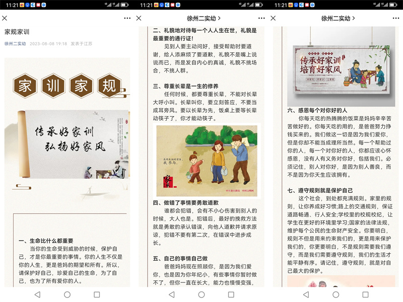 为增强"家风家训"宣传工作的效果,使这项活动不流于形式,二实幼从自身实际情况出发,精心设计和组织开展了内容鲜活、形式新颖、吸引力强、群众乐于参与的系列活动。一是利用公众号和班级微信群,进行"家风家训"工作宣传,上传部分党员的廉洁家书和清廉家训,讲述家风家训的意义。二是组织党员干部到党性锤炼中心现场学习,大家通过看家风主题展览,学警示教育读本,观忏悔视频,签订廉洁承诺等多种形式接受党性淬炼,推进我园党员干部党风廉政建设,重塑优良家训、重整文明家风,助推"幸福"建设。