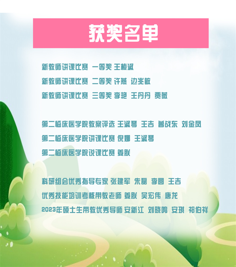 教学工作会议环节,杨秋丽副院长首先就医院教学工作取得的成绩给予了肯定,同时对今后的教育教学工作发展提出了希望和要求。田书记在讲话中要求,临床教师一要坚定理想信念,不忘立德树人初心,牢记为党育人、为国育才使命,自觉加强师德修养;二要加强学习实践,全面提高业务能力,不断规范带教活动,不断提升教学质量;三要发挥临床学院特色,在带教过程中以临床问题为导向,培养学生临床思维。随后,医院对在徐医大第二临床医学院组织的教案评选比赛、讲课比赛、说课比赛中获奖的老师,对本院评出的“优秀技能培训带教老师”、“科研组会优秀指导专家”、“硕士生带教优秀导师”以及在第一环节讲课比赛中获奖的老师共计24人次予以了表彰,硕导代表刘晓鸣主任、获奖教师代表王淑琴医生分别发言。