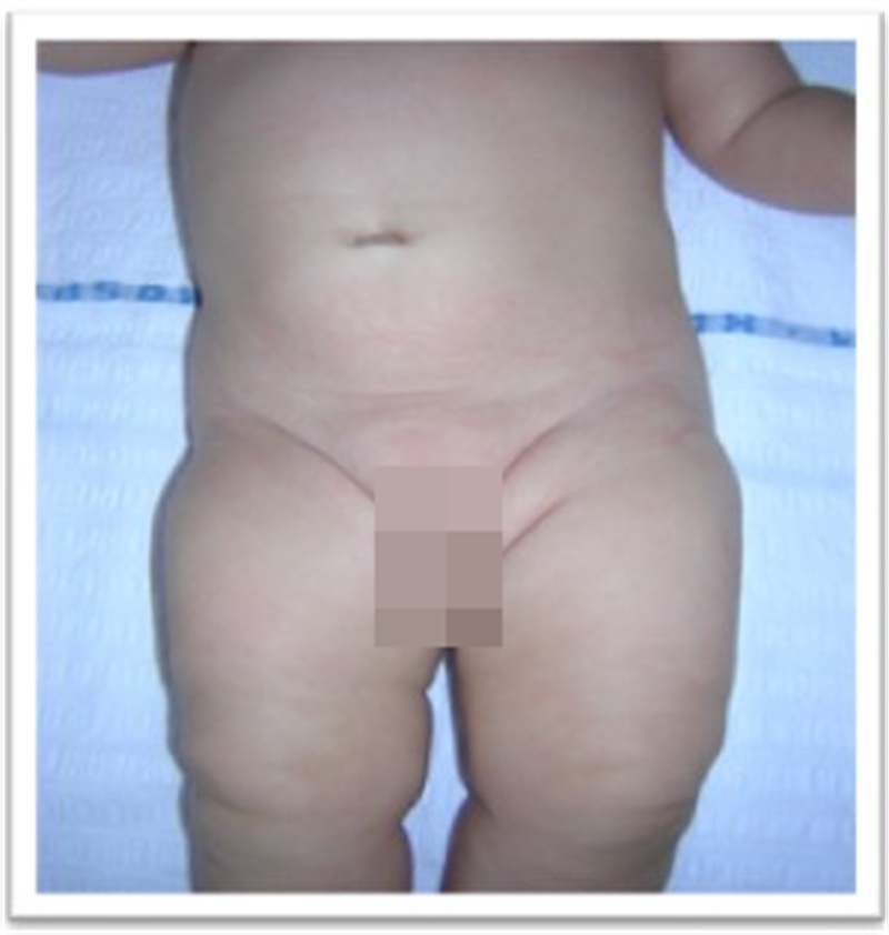 发育性髋关节的脱位的诊断与治疗注重一个“早”字,即早发现、早诊断、早治疗。如何做到早发现、早诊断呢。主要是对存在高危因素的孩子早筛查。一般来说发育性髋关节脱位在女孩多见,第一胎多见,怀孕时胎位为臀位的为高危因素,尤其是家族中有髋关节脱位病史的要高度关注,如出生后发现孩子双下肢不等长,臀纹不对称(见图1),关节有弹响,双髋展不开,或合并有“斜颈,马蹄内翻足”等畸形的应及早来儿童医院骨科进行筛查。对能独立行走的孩子,如出现无痛性的跛行,或走路较同龄孩子晚,均应到儿童医院骨科就诊。筛查的手段除常规的询问病史,查体外,还要进行影像学检查。对小于4月龄的孩子,行髋关节B超检查,4月龄以上的孩子,需进行骨盆平片(图2)的检查。对诊断明确的患儿,要及早进行治疗,治疗越早,方法越简单,创伤越小,效果越好。一般来说:对≤6月龄的孩子,是治疗的黄金阶段,多采用保守治疗的方式,如支具治疗;6-18月的患儿多采用闭合