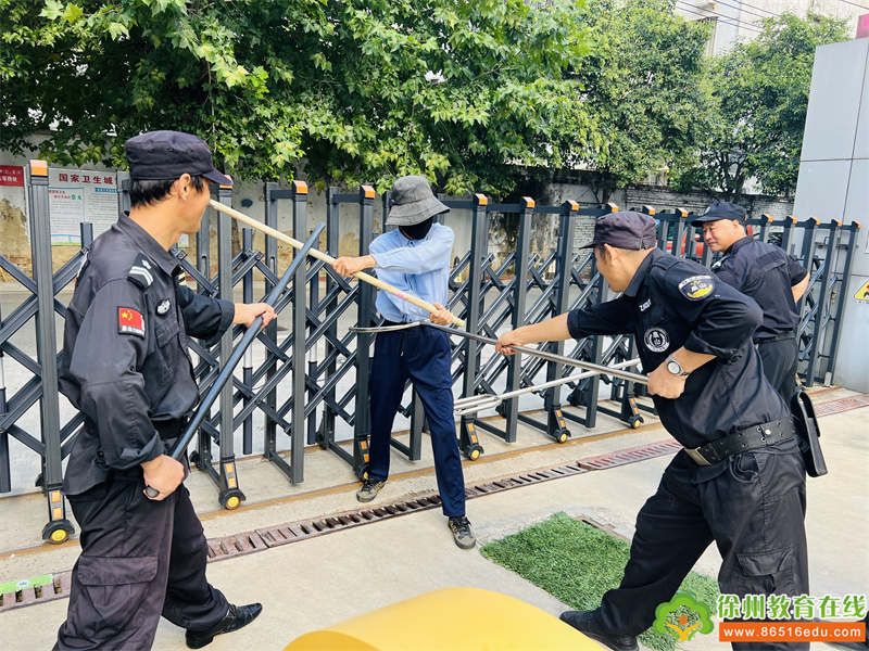 一名“歹徒”强行闯入幼儿园,幼儿园保安立即拿出安保器材与“歹徒”进行周旋,并阻止“歹徒”进入园区。