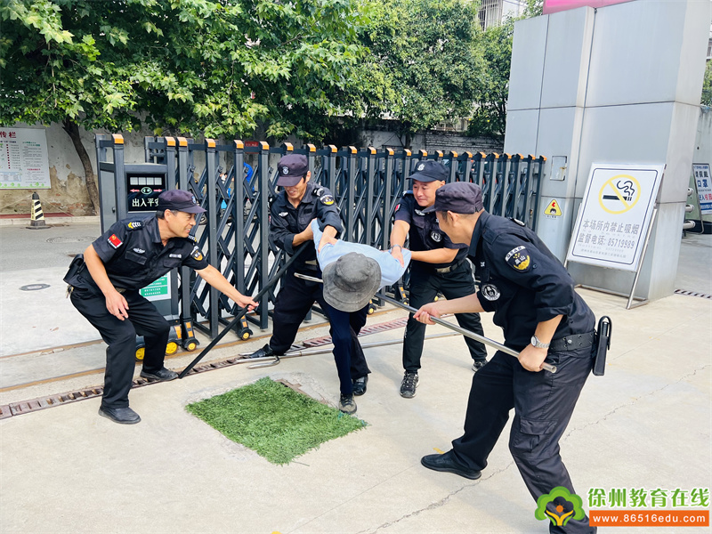 最终,保安迅速反应通过使用橡胶棍、防暴钢叉等阻止歹徒,迅速将施暴的“歹徒”团团围住,临危不乱,并对“歹徒”进行了成功的抓捕,保护了全员师幼的安全。