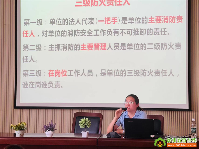 安全工作是幼儿园的重点工作,是开展教育教学工作的基本保障,应常抓不懈。为切实加强校园安全管理,确保为师幼提供一个安全舒适的工作学习环境。星二人齐心协力对户外环境、活动室、主题资源室、器械室、会议室进行全面清查和整理;幼儿园安全领导小组对户外场地、消防设施、安全用水用电线路、食堂设施设备等进行全面深入细致的检查和维修,确保各项设施的安全和正常使用,不留一处安全隐患。为了强化全体教职工消防安全意识,积累消防逃生技巧,切实做好幼儿园安全工作,幼儿园邀请了杨洁教员对全体教职工进行了消防安全培训。