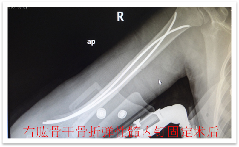,弹性髓内钉内固定解决了这个矛盾。有人说,弹性髓内钉的出现是上天对儿童的恩惠。的确,弹性髓内钉是治疗小儿长管状骨骨骨折的一种理想、可靠的内固定方法。弹性髓内钉技术发源于法国,在欧洲广泛应用后,现已为全球所接受,被称为是儿童骨科界的一次革命。徐州儿童医院骨一科应用弹性髓内钉技术治疗四肢长管状骨骨折,具有创伤小、恢复快、并发症相对少,孩子能较快恢复正常生活、学习等优点。该技术先将骨折闭合复位,通过微小的切口将特制的弹性髓内钉置入骨髓腔,达到固定骨折的目的。适用于肱骨,股骨,尺桡骨等部位的常见骨折。