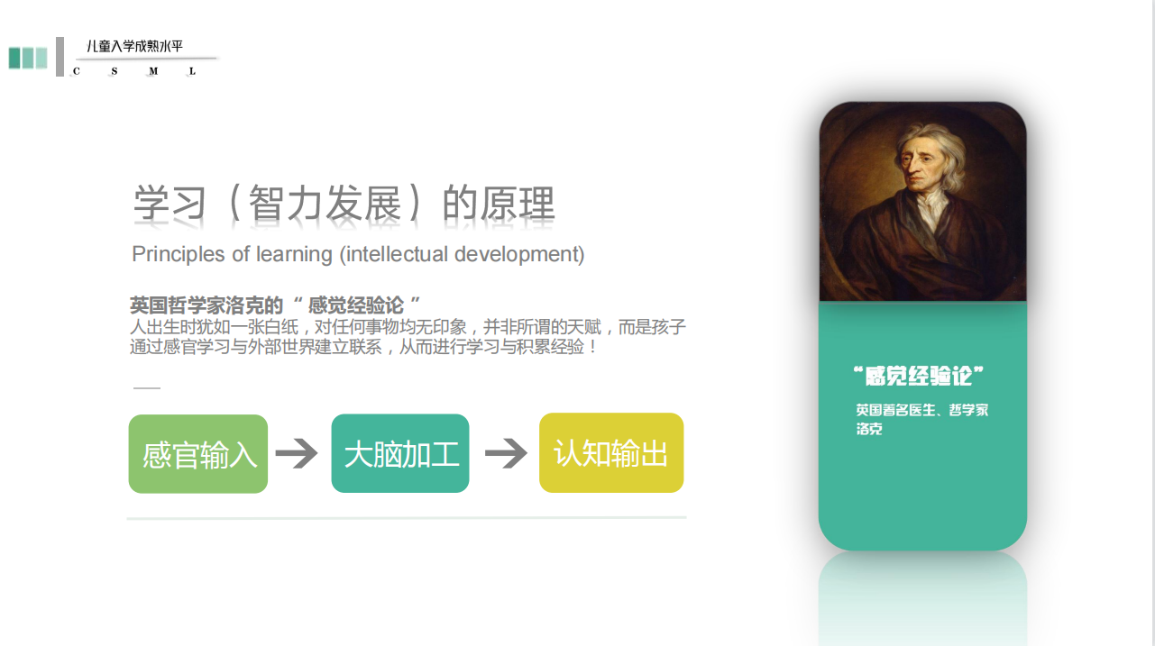 从英国教育家洛克的学习原理出发,重视幼儿的感官输入,使教师们了解到六岁以前是打通感官通道的关键时期,只有打通了视觉、听觉等多种感官通道,才能为上学后接受大量知识提供便利。