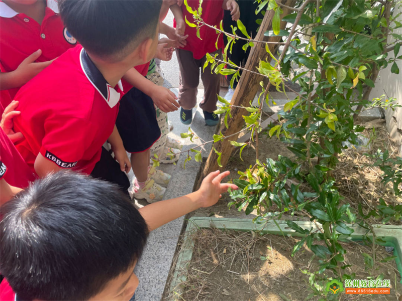 幼儿园里的石榴树上挂了一颗颗很大的石榴,看起来很好吃的样子